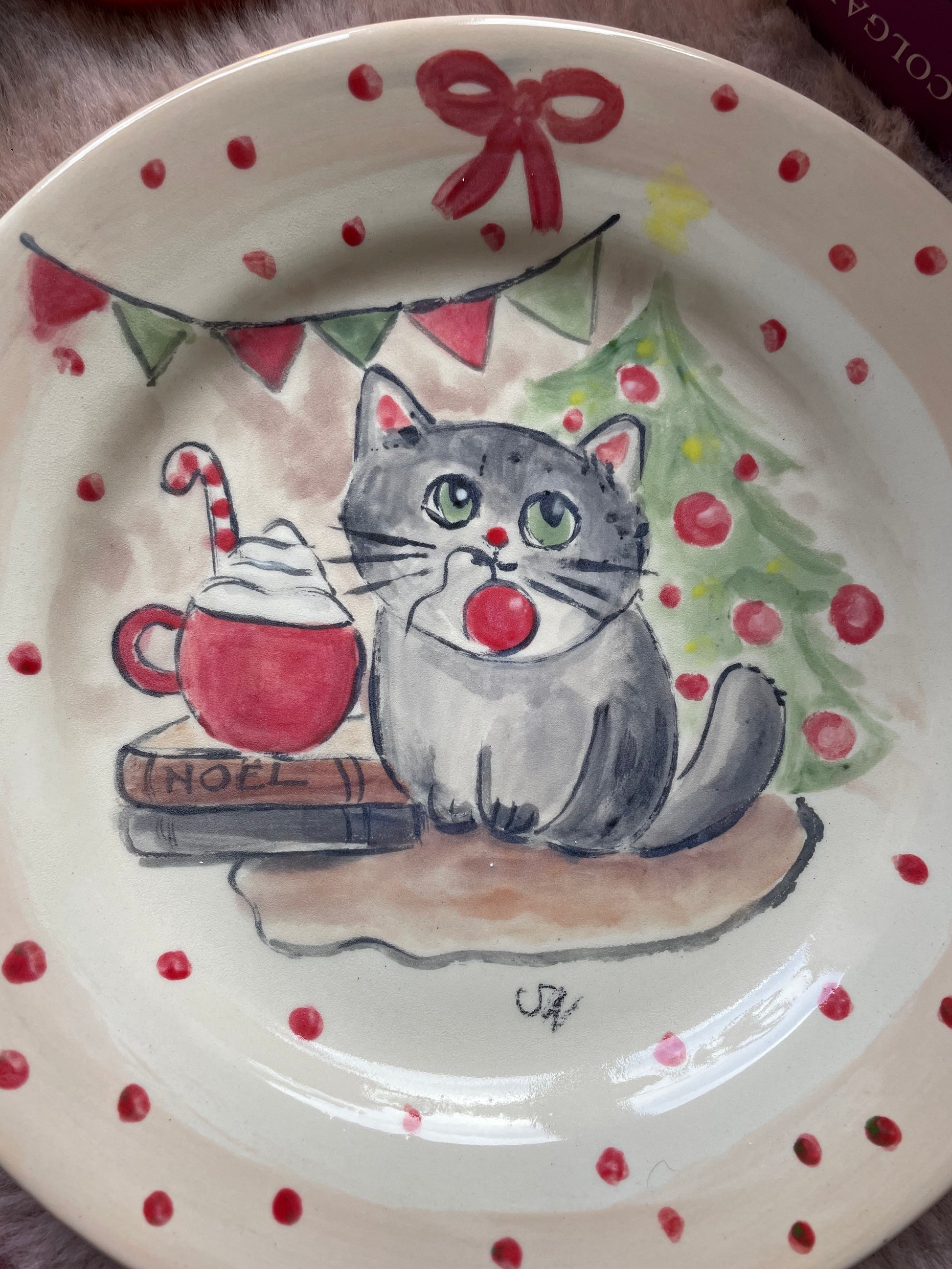 Pièce unique créée en faïence à l’aide d’un moule puis suite à une première cuisson appelée biscuit, j’ai illustré à la main au grès de mon inspiration cette jolie assiette conçue pour des goûters chaleureux et cosy. Le chat est ma source d’inspiration principale, mon petit compagnon préféré. Elle a ensuite été émaillée par mes soins puis a subit une seconde cuisson.