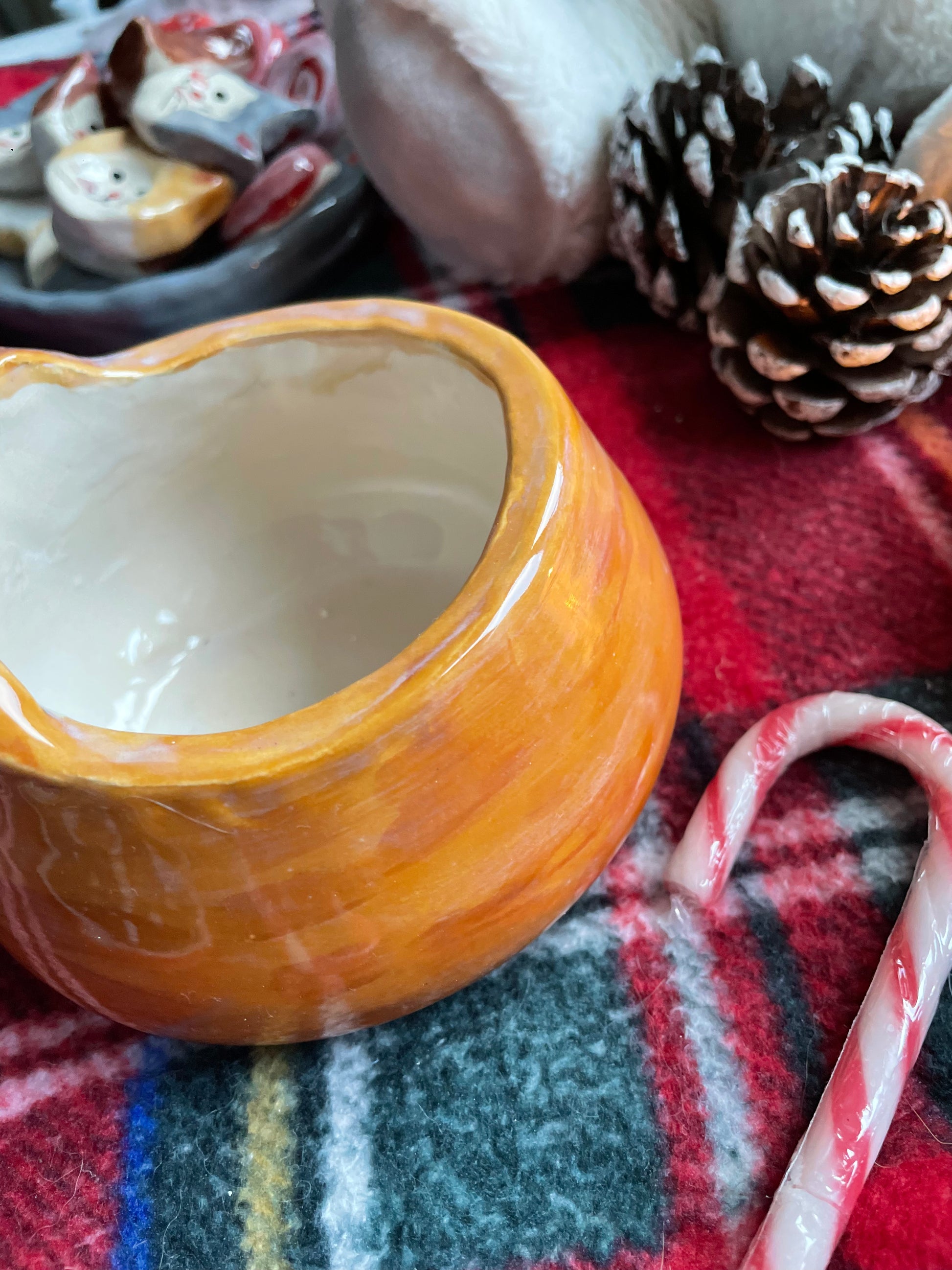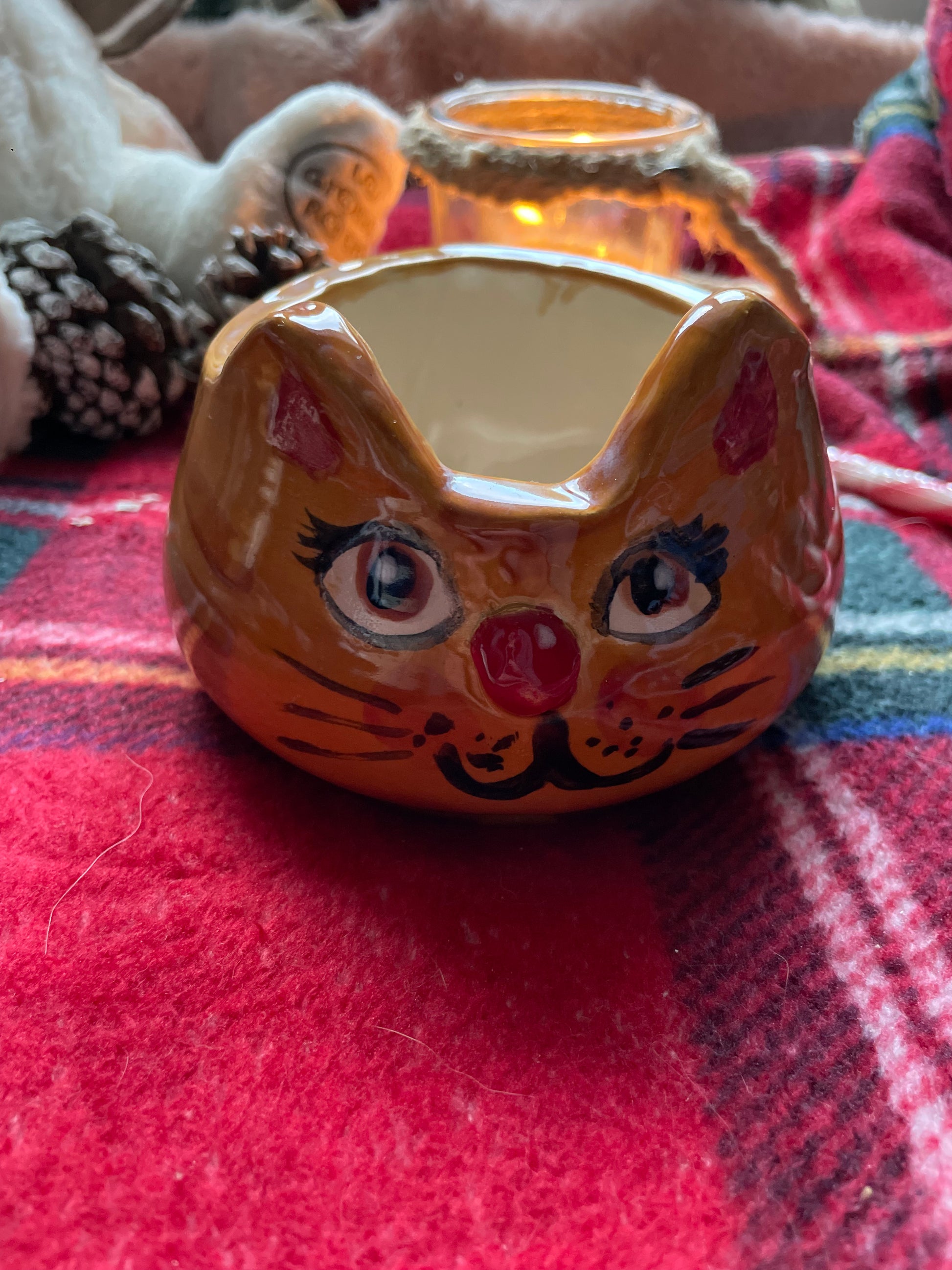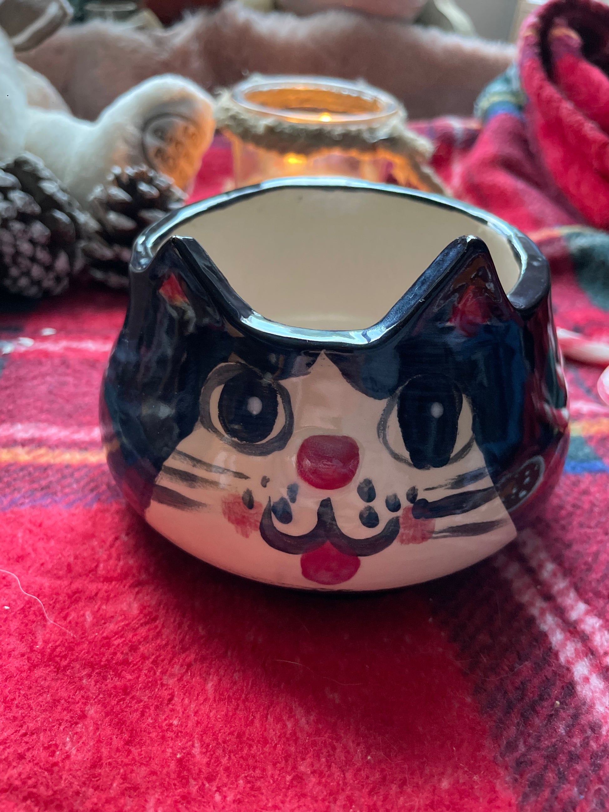 Pièce unique créée en faïence à l’aide d’un moule puis suite à une première cuisson appelée biscuit, j’ai illustré à la main au grès de mon inspiration ce joli bol de la forme d’un chat …. Elle a ensuite été émaillée par mes soins puis a subit une seconde cuisson.