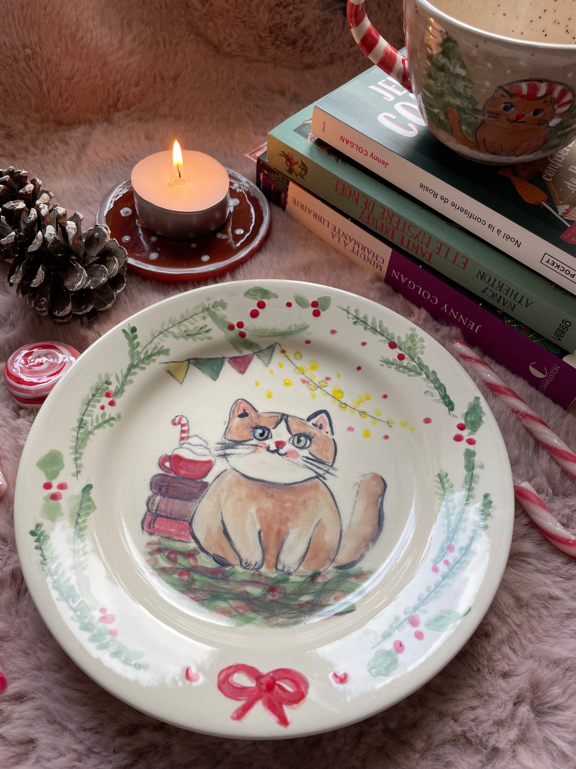 Pièce unique créée en faïence à l’aide d’un moule puis suite à une première cuisson appelée biscuit, j’ai illustré à la main au grès de mon inspiration cette jolie assiette conçue pour des goûters chaleureux et cosy. Le chat est ma source d’inspiration principale, mon petit compagnon préféré. Elle a ensuite été émaillée par mes soins puis a subit une seconde cuisson.