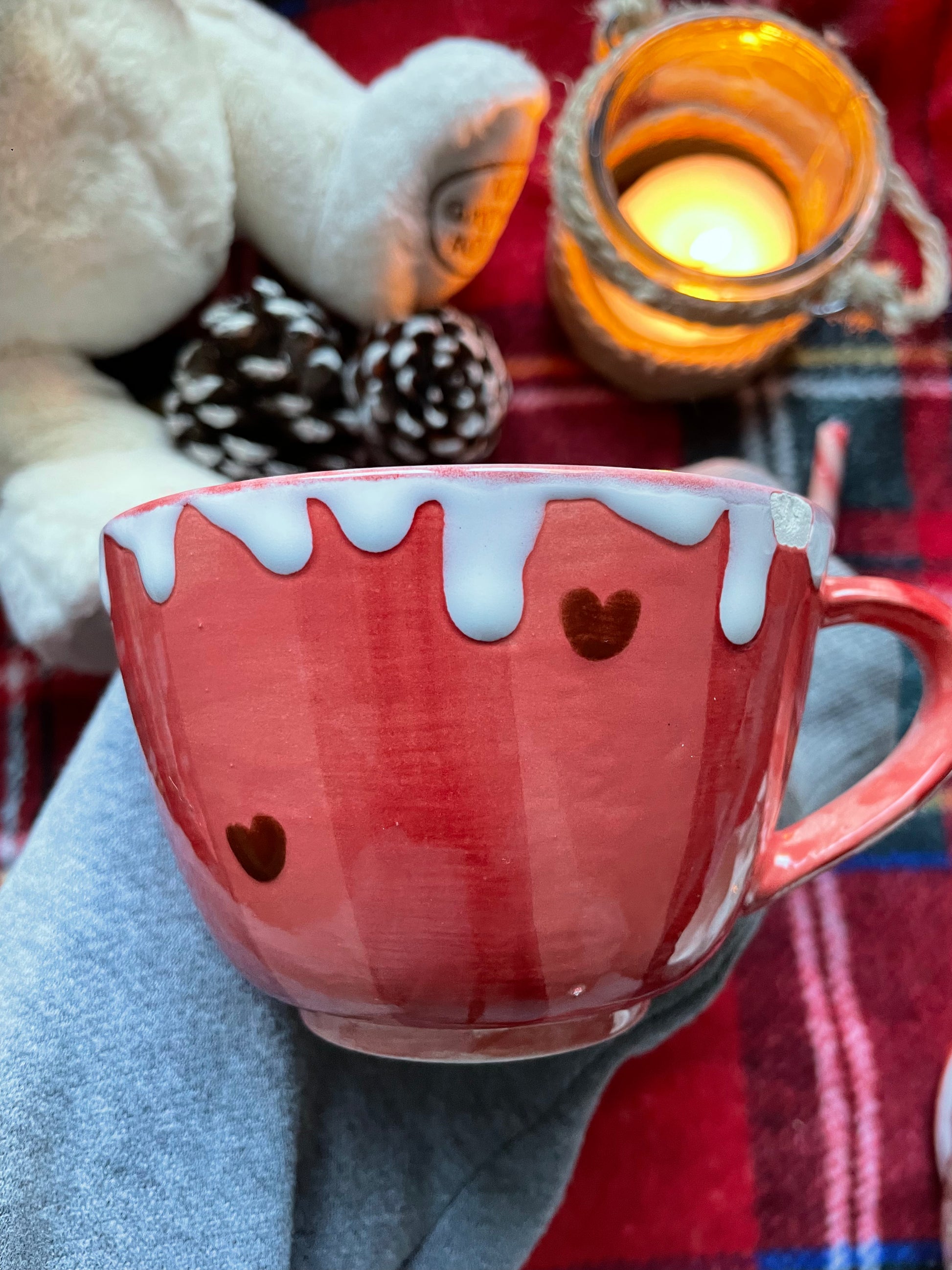 Pièce unique créée en faïence à l’aide d’un moule puis suite à une première cuisson appelée biscuit, j’ai illustré à la main au grès de mon inspiration cette jolie tasse conçue pour les boissons chaudes l’hiver près du poêle ou sous un plaid avec un bon livre…. Elle a ensuite été émaillée par mes soins puis a subit une seconde cuisson.