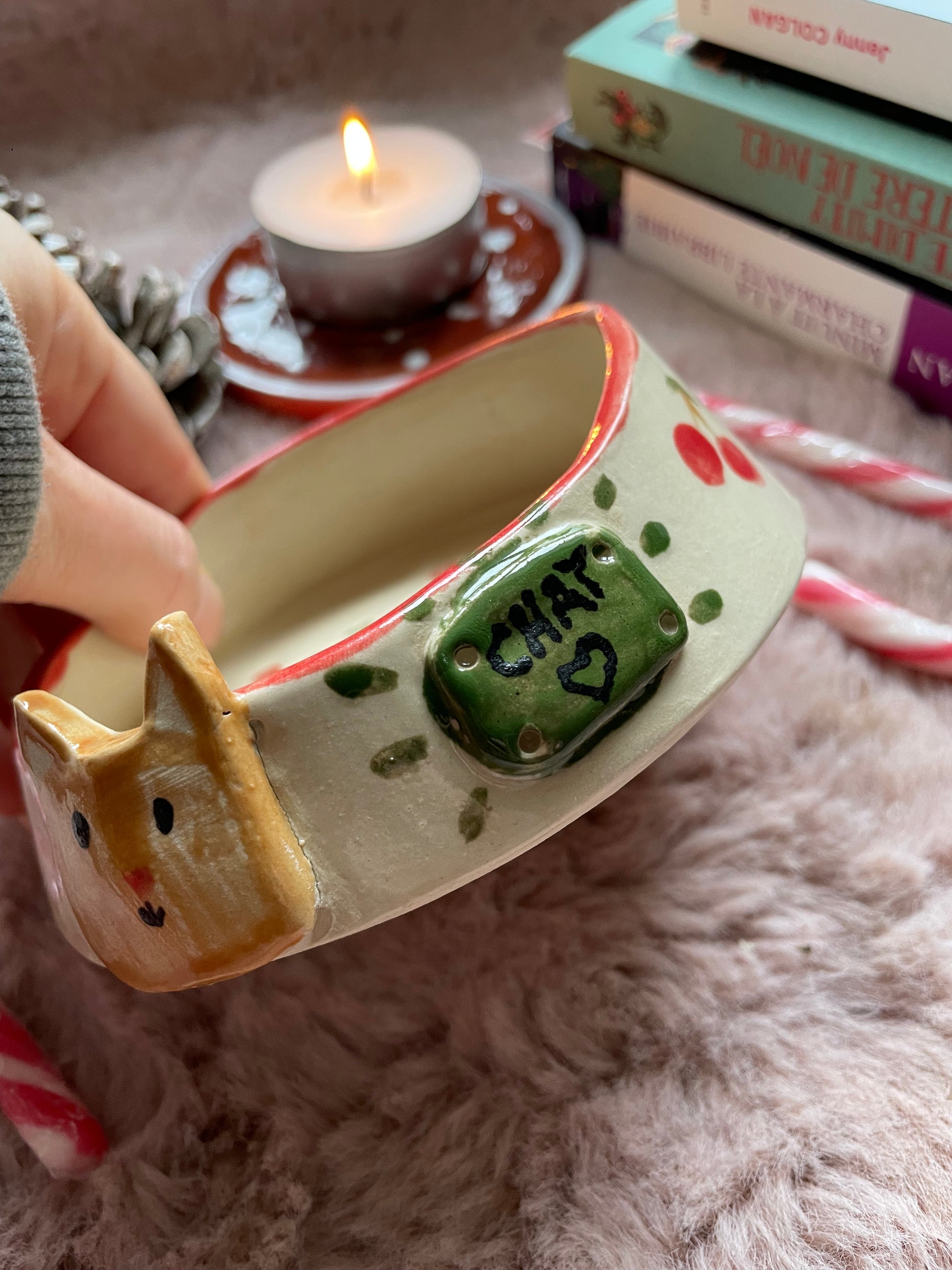 Pièce unique créée en grès moulé la main puis suite à une première cuisson appelée biscuit, j’ai illustré à la main au grès de mon inspiration…. Elle a ensuite été émaillée par mes soins puis a subit une seconde cuisson.