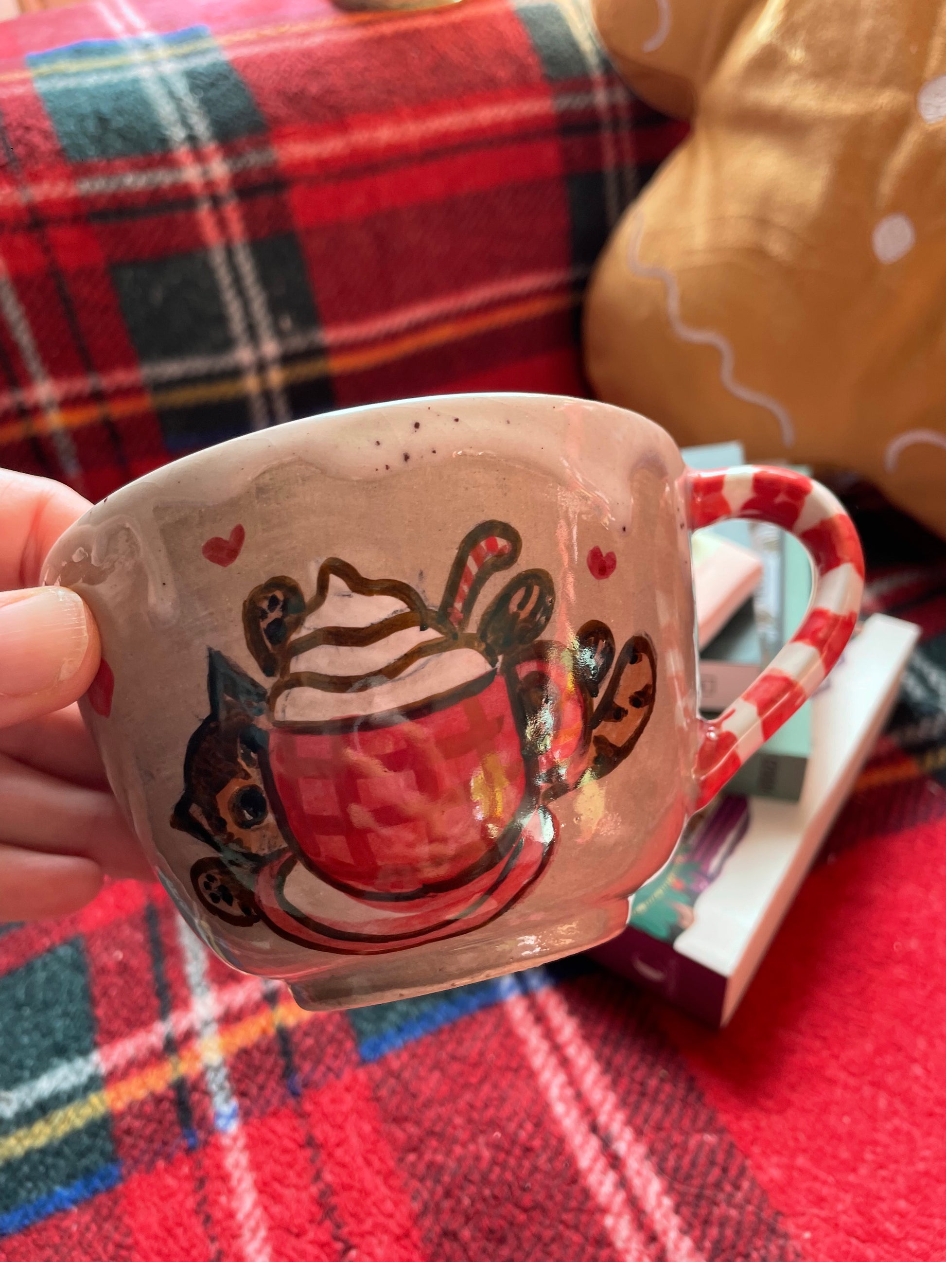 Pièce unique créée en faïence à l’aide d’un moule puis suite à une première cuisson appelée biscuit, j’ai illustré à la main au grès de mon inspiration cette jolie tasse conçue pour les boissons chaudes l’hiver près du poêle ou sous un plaid avec un bon livre…. Le chat est ma source d’inspiration principale, mon petit compagnon préféré. Elle a ensuite été émaillée par mes soins puis a subit une seconde cuisson.